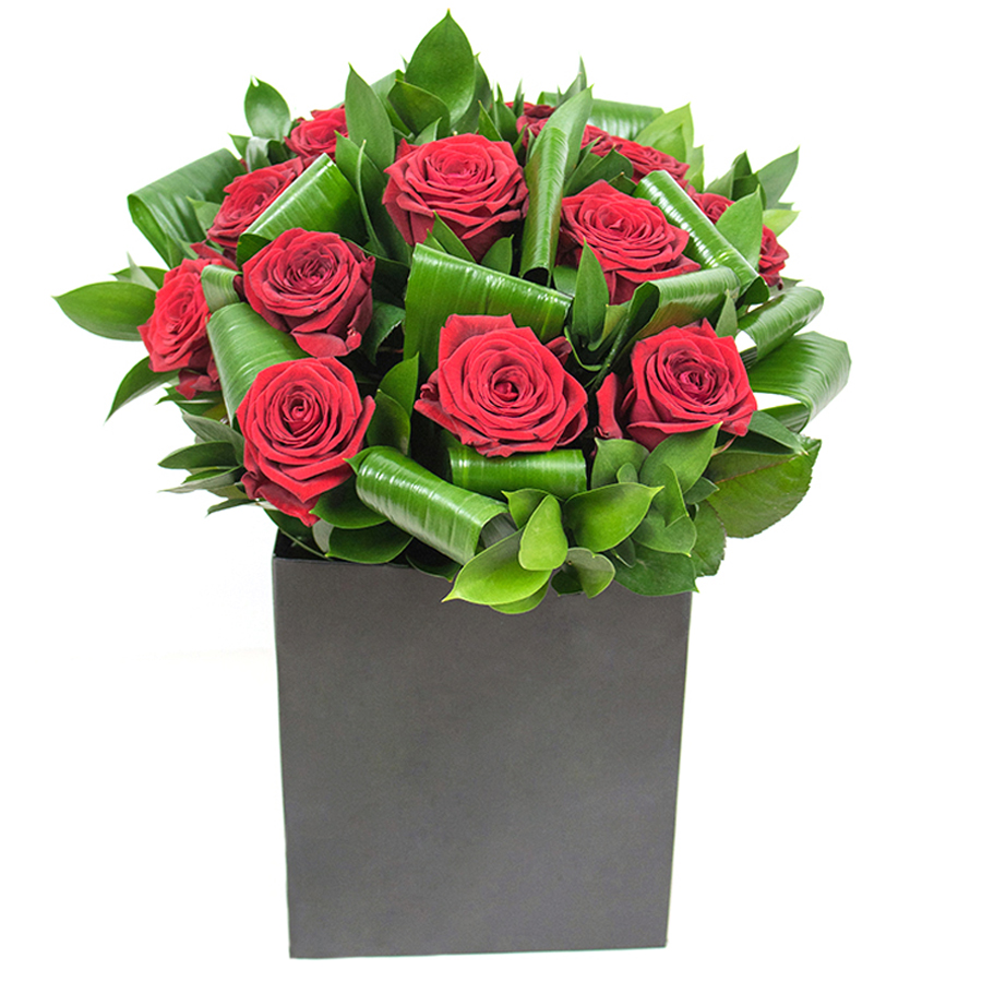 Add a touch of sophistication to any setting with our red rose bouquet, beautifully complemented by lush aspidistra leaves and soft ruscus. This unique arrangement combines vibrant colors and elegant design for a truly stunning display.