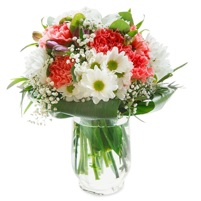 A sunlit bouquet, artfully arranged with a sense of joy, evokes the welcoming spirit of New Southgate. Coral and peach carnations puff out in lush, ruffled layers, their colour both uplifting and soft, setting the tone for the arrangement's gentle vibrancy. Interspersed are crisp white daisies with playful yellow-green centers, their faces open and bright-like a sunny walk through New Southgate's local gardens after rain. Clouds of baby's breath bring a touch of gentle innocence, their tiny, airy blossoms softening the bolder shapes and inviting a closer look. Across one edge, purple-tinged buds peek out, whispering of spring's promise and hidden potential. All this is surrounded by rich, deep green foliage, whose waxy leaves curve protectively around the blooms, giving structure and a feeling of abundance. The whole bouquet is cradled in an elegant white gift bag, complete with smooth ribbon handles, embodying the ease and care of doorstep flower delivery throughout the New Southgate area. The bright, clear light in the photograph reveals each petal's fine detail and heightens the freshness, offering a sense of hope and celebration-perfect for birthdays, warm welcomes, or simply brightening a loved one's day close to Friern Barnet. Every element, from texture to colour harmony, reflects both the artistry and warmth of a true New Southgate florist. This bouquet, arranged with care by local New Southgate florists, is a living testament to the tender joys of spring's first bloom. Presented on a spotless white surface, it bursts with cheerful white daisies and plush coral-pink carnations-each flower chosen for its lively hue and textural richness. Wisps of delicate gypsophila flit throughout the bouquet like tiny stars, creating a dreamy, almost weightless feel. The subtle inclusion of blush-pink alstroemeria buds and eucalyptus foliage adds both gentle perfume and harmonising tones, a nod to the quiet beauty found in New Southgate's parks and residential gardens. The composition radiates outward in soft, balanced layers, conjuring feelings of celebration, renewal, and the heartfelt touch only an expert local florist can provide. This uplifting bouquet is ideal for birthdays, joyful milestones, or simply as a gesture to lift a friend's spirits in Bowes Park or through a delivery to nearby neighbours. The overall mood is tranquil yet exuberant, blending freshness with sophistication-a vibrant memory of New Southgate's blossoming streets, brought to life in flowers. This bouquet, expertly crafted in New Southgate, radiates the gentle joy and clarity of an English spring morning. Coral pink carnations form the lively heart of the arrangement, their lush, ruffled petals overlapping to create depth and texture reminiscent of blooms gathered just outside Broomfield Park. Nestled among them, multi-petaled white chrysanthemums and classic daisies with bright green-gold centres offer a fresh, sunlit vibrancy. Wisps of pure white baby's breath weave delicately through the bouquet, casting a subtle, cloud-like softness over the whole composition. Peeking through on one side, the magenta-tinged alstroemeria buds quietly suggest coming changes and new beginnings. All this vivid beauty is anchored by a graceful collar of broad green leaves, their glossy surfaces reflecting the bright, even lighting that washes over the display. Arranged in a clear glass vase with visible waterline and stems, the bouquet is presented against a pure white background-inviting every colour and texture to shine. This arrangement, available for same-day delivery across New Southgate's friendly neighbourhoods, is a perfect expression of celebration, gratitude, or comfort, designed to bring an immediate sense of peace and heartfelt connection into any local home.